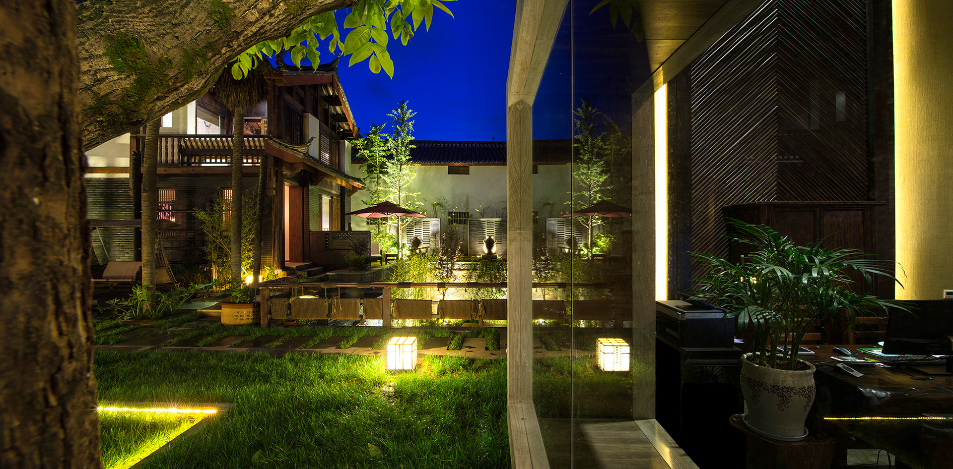 酒店主院东院的绿化带呈回字形,在回字的中心,放置着一个圆鼎,体现了中式禅意圆中有方,方中有圆。