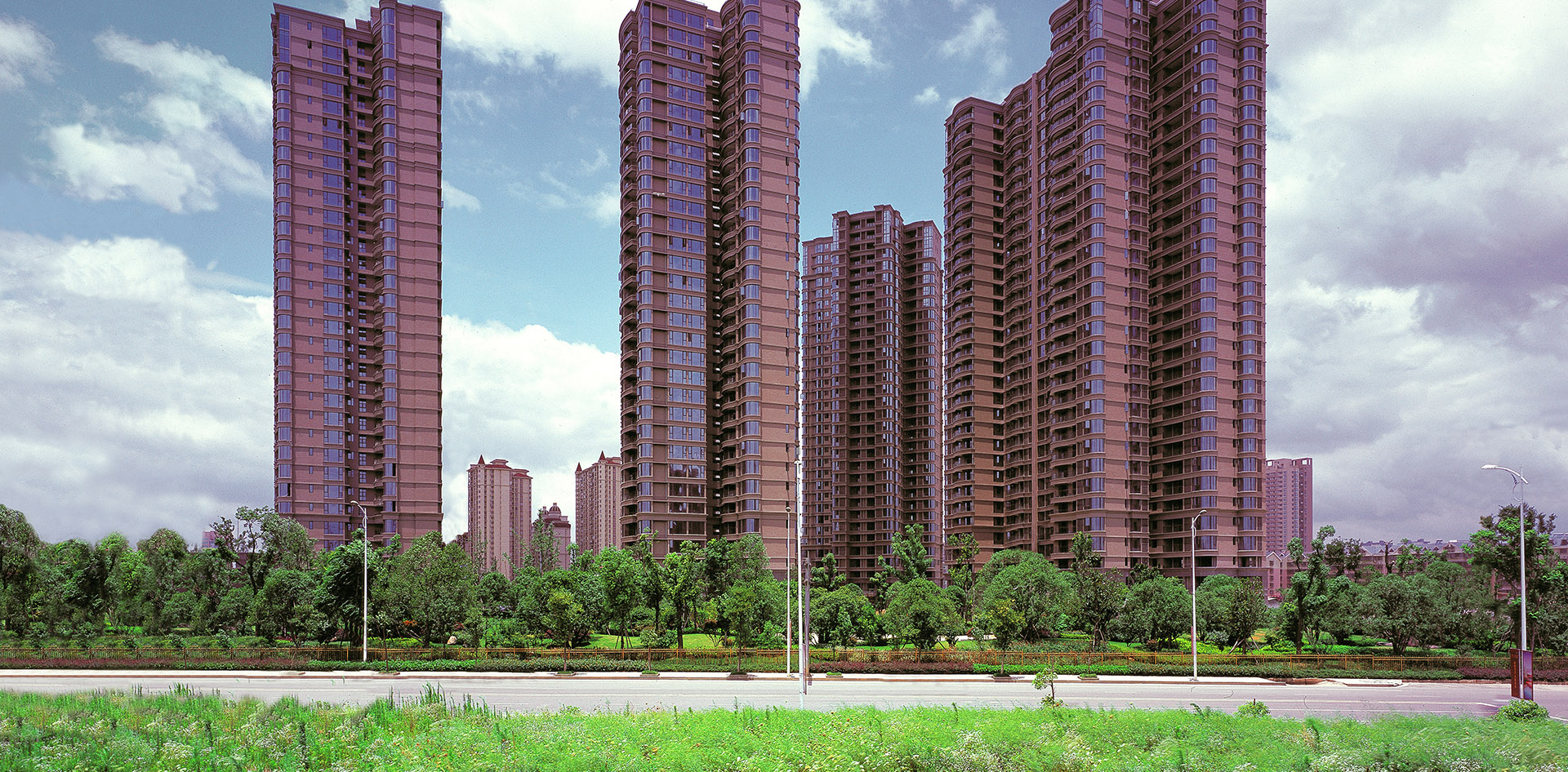 项目充分借助沿风光带打开面较宽的优势,采用半围合布局,最大尺度上满足业主东河的资源优势;同时营造出完美的建筑天际线。整个住宅群呈现南疏北密的建筑格局,错落有致。