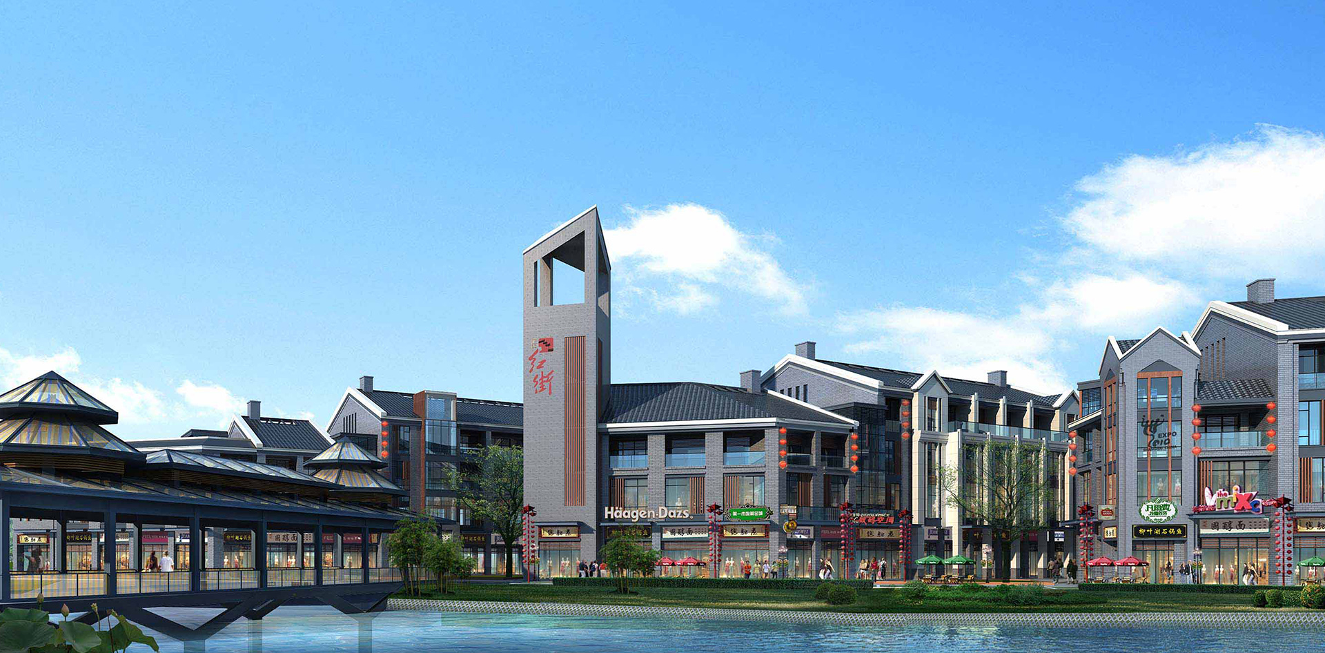 在考虑传统文化的同时,结合现在中式建筑的设计理念,用心体会游人购物者的心理需求,通过“小镇”这个载体,将传统和现代相结合。在单体设计中,传统意境即表现在建筑的外在形式上,又可体现在内部的空间设计中。前者有直观视觉效果,而后者则彰显内涵,并能更深层次地表达出传统韵味,因此,在建筑外表低调、优雅的同时,内部空间设计更是吸引了红安居民的空间精神,体现地域文化。