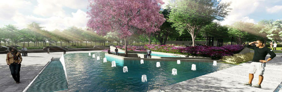 中央广场两旁,绿树、青草、红花相互映衬,清澈的水柱呈同一弧度喷向两边形成独特的水景,所到之处皆有大面积的泉水,让人在酷热的夏天在心理上得到半分清凉的慰藉。