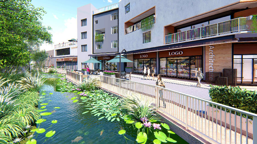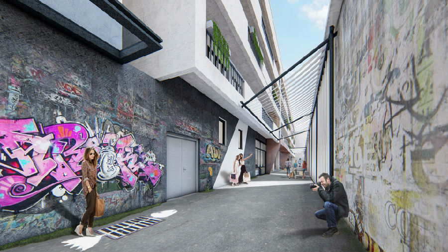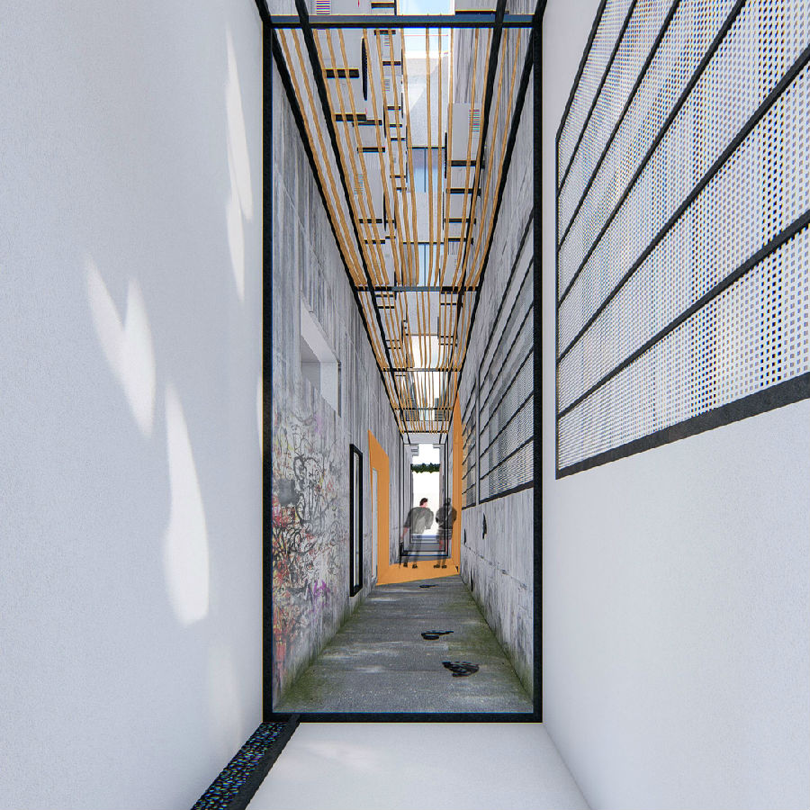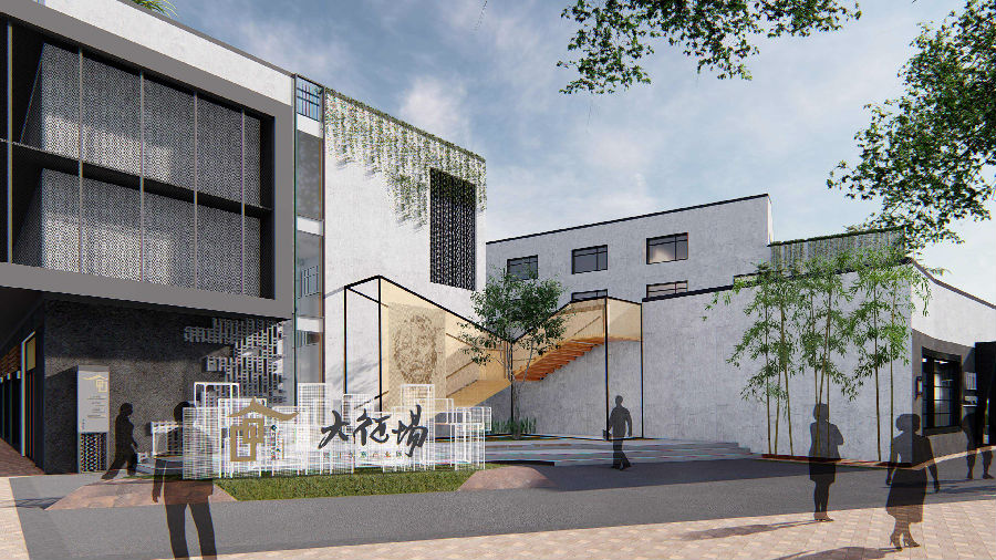 地块西北侧的河涌原本是脏乱差的代表,还有异味弥散在空气中,设计整治后改造成休闲景观亲水平台,提供给开放式商业用作室外延展空间。园区内原本幽暗逼仄的通道化身成为艺术打卡长廊。东侧的一块空地设置停车场,完美解决了办公停车的需求。至此,旧厂房化身大征场。