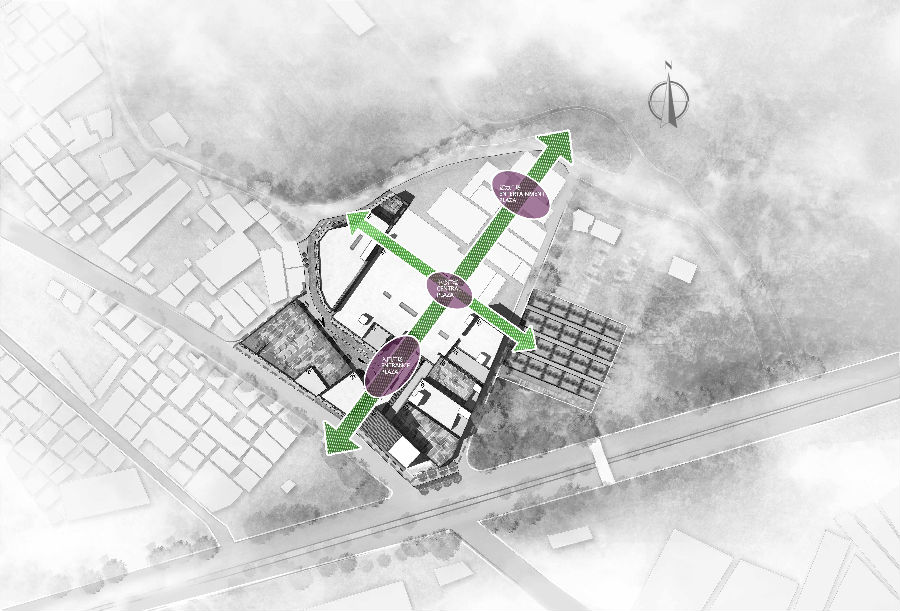 为焕发本案地块及其周边的活力,整个园区以开放式的外部空间呼应大征场的格局,以两条交错的主轴线重新划分功能布局。沿用原有厂房的基础建筑框架,以“生命力”、“未来感”、“交互性”为原则,重新植入设计行业链条中的不同环节,健全其筋骨使其运作自如,形成一方小天地,辅以商业,公寓,独栋办公租赁等业态,丰满其血肉,重新赋予老旧厂房价值。