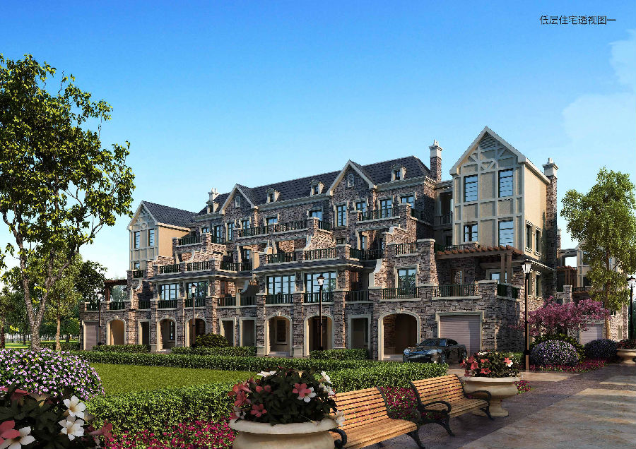 进入门口穿插于高低错落的建筑间,独特的建筑立面风格充分汲取“典雅主义”的构图手法,追求高耸、挺拔、向上的气势,比例工整严谨,细节造型考究、偶有花饰,但不拘泥于程式。整体造型同时延续本项目别墅的风格和色彩,给人以优美的新古典主义气息,有条理有计划的安定感。