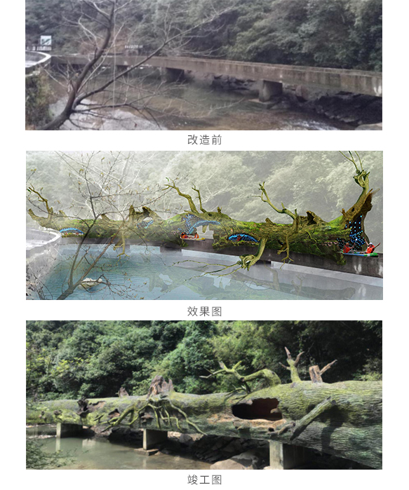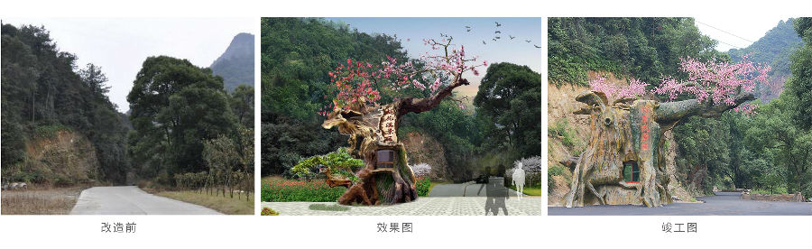 景区入口:设计以桃花树为原形做生态仿生设计,门楼保安岗亭融入桃花树桩内,生态和谐自然设计。