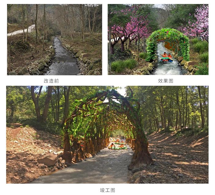 以“十里画廊,心花怒放!”为主题,漂流道全程近十里长。将其打造成国内最梦幻的画中漂流体验。增加花海、雾化、主题雕塑、蟒蛇绕树、近百米树洞漂流道等内容,打造人在画廊中心花怒放的漂流体验。
