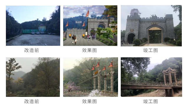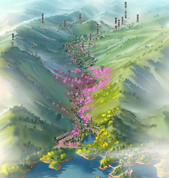 在项目落地过程中,秉承自然与人工完美的结合的原则,利用先进施工技术以及声光电技术,创造非凡体验。通过声光电技术导入和林相改造,以十里桃林、摩崖石刻、亭台廊榭、景观设施等形式,营造一种人间仙境的旅游氛围。