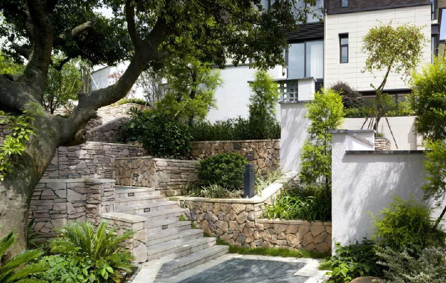 远离尘世,回归自然。水池清气沁人心肺,冲涤心中的烦躁。在高低错落的地形上,巧妙地在幽静的小湖的源头设计跌水的瀑布对景,让平静的湖面增加一丝丝的活跃气氛。