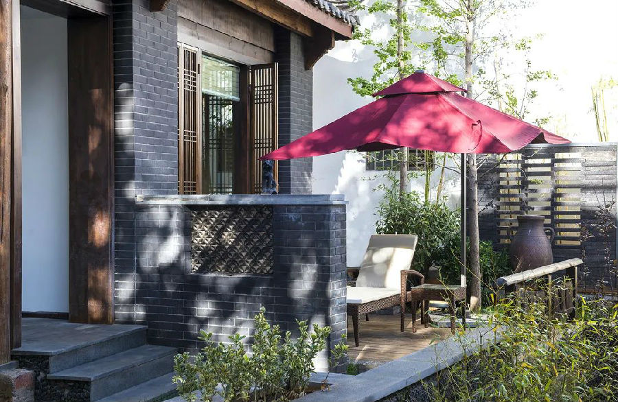 西院则融入了现代人居理念,方形的装饰水池旁放两张沙滩椅,闲来无事在水边晒晒太阳。水池对面的构图有着古色古香的中国画味道,运用漏窗和国画留白手法,漏窗后长出的翠竹,耐人寻味又给人以想象空间。