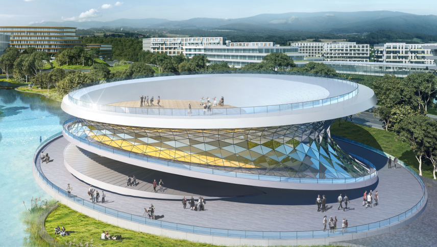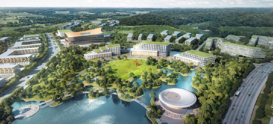 这是一个以3E City理念定位,打造的集职业教育、智能生产、科研孵化、尚品居住、商业配套于一体的智慧新城。在呈扇形的基地上,采用“中心突出、灵活组团、局部集中”的布局模式,形成“一心、一轴、一环、九组团”的规划结构。