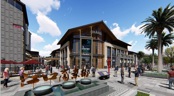 在景观上,在商业空间设计中加入绿植、灯光、水系、雕塑等元素,彰显项目主题特色的同时,从感官上营造人与商业的互动场景,给人以强烈的场景体验感。