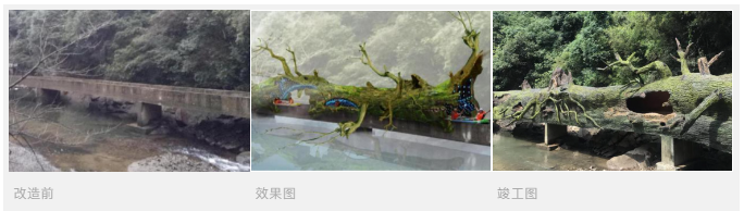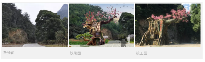 景区入口:设计以桃花树为原形做生态仿生设计,门楼保安岗亭融入桃花树桩内,生态和谐自然设计。