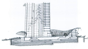 大厦周边的裙楼的设计也是经过一番考量,从动态的溅水设计变成最后静态的涟漪设计。破浪大厦从整体看起来,宛如一棵傲然挺立的竹周边泛起微微的涟漪。
