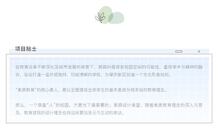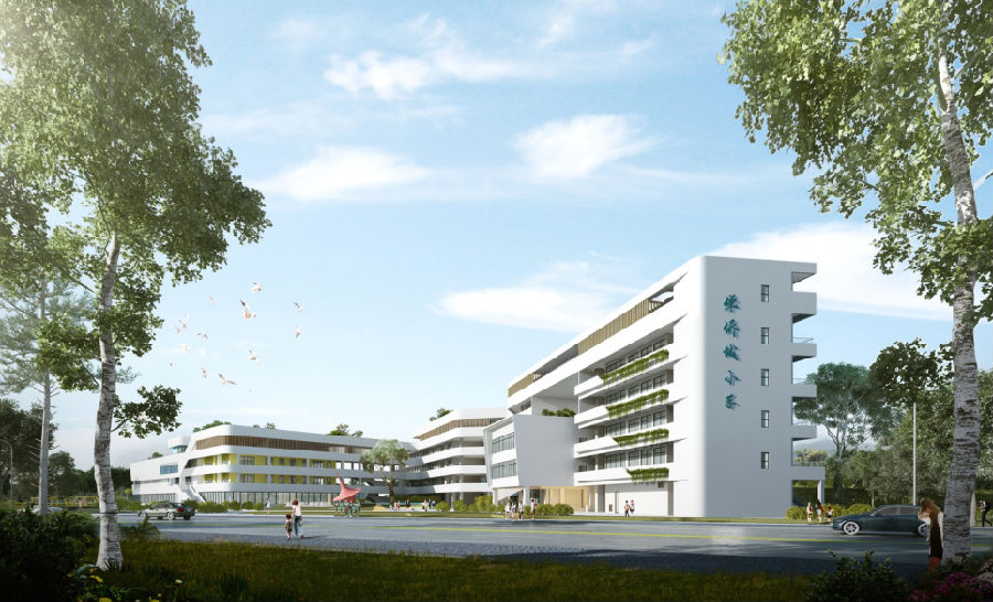 设计者依托得天独厚的景观资源,引入“新式教学楼”设计风格,结合现状地形,平地布局,通过花园分隔各建筑,形成立体绿化活动平台,让每间教室都有自己的 “私家花园”,极力打造一个“山水花园 " 式园区,让祖国花朵在自然环境中学习成长。