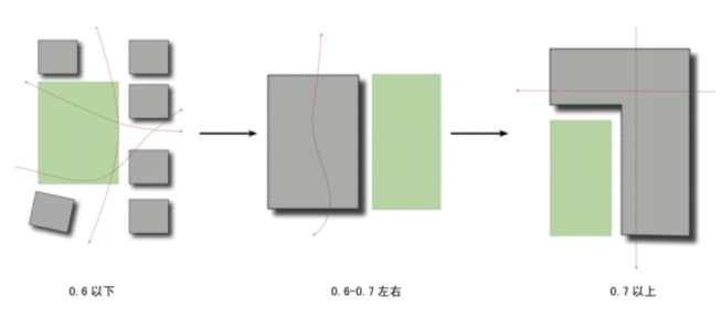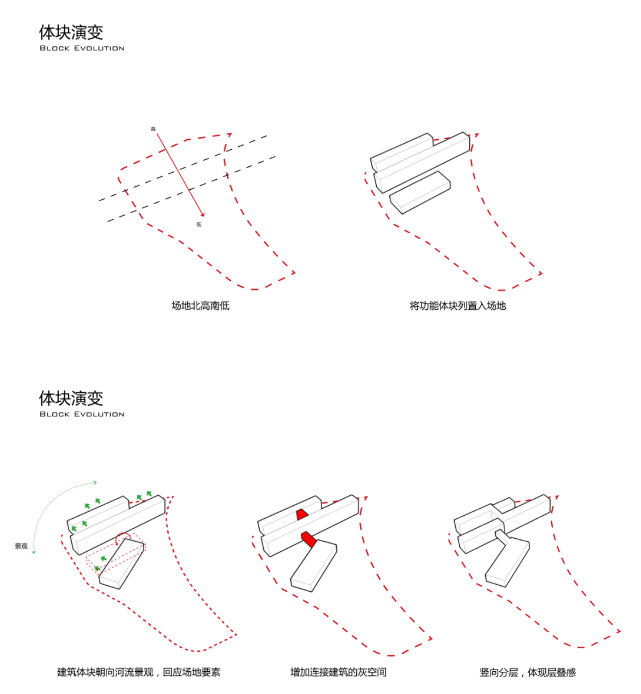 建筑布局遵循从自由多院落布局,向轴线布局,再到“L”型布局的过渡,很显然,低容积率的空间感受更加舒适,空间变化也更为丰富,实现美感与舒适度相统一。