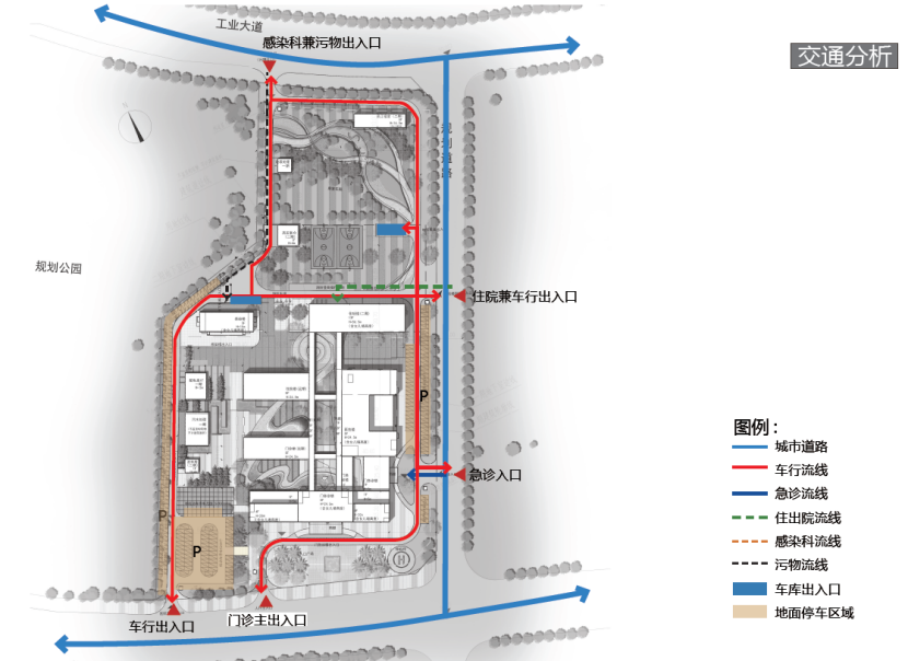 交通设计上,院区流线设计上,团队以“出入分流、医患分流、洁污分流”为原则,从出入交通,到各功能区域的连通对接,甚至每栋大楼的电梯分布与停驻时长,提出了专业的、符合医疗特征的设计方案,避免了人、车流量与建筑规模不匹配,建筑入口广场过小或过大与实际集散需求不匹配的问题,以及可能出现的交叉感染问题。