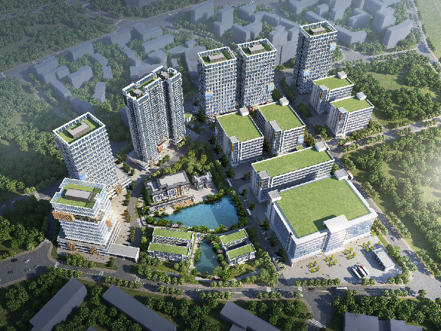 百米研发厂房沿北侧金和街布置,园区中心设置超大生态湖景,为园区营造了绝佳的办公生活环境,生产性厂房沿隆盛路两侧成组布置。整个园区规划分区明确,建筑北高南低,高低有序,丰富的天际线引领着城市新高度。