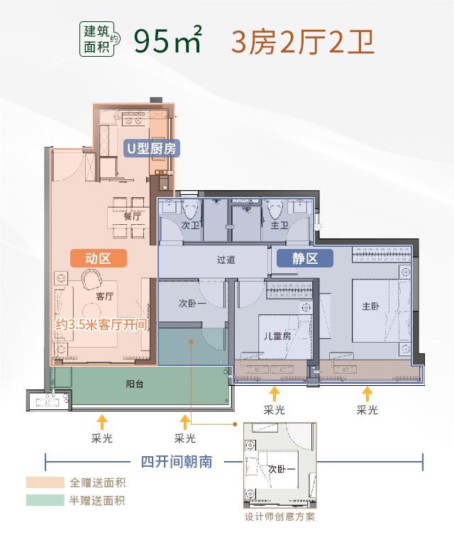 户型特点更是值得一提:户户都朝南,主阳台都是长阳台,连通客厅与次卧,增加南向采光面。